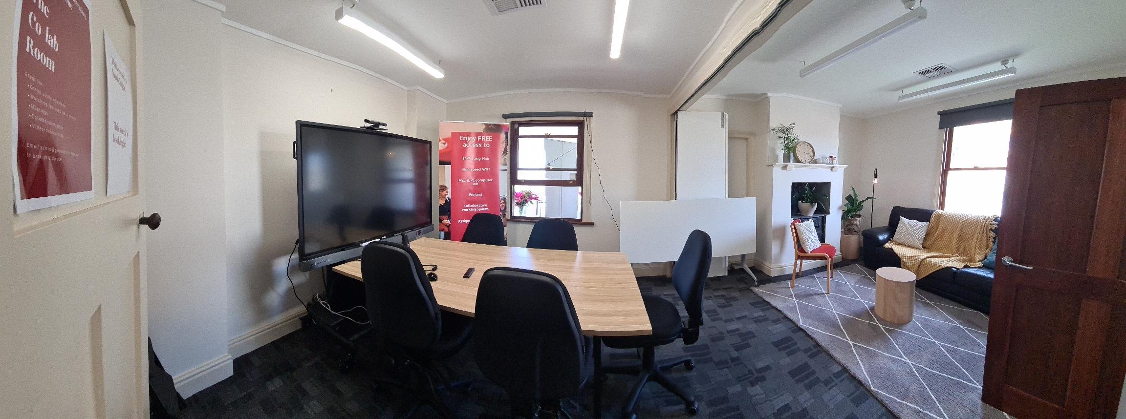 The Co-Lab Room, equipped with a BENQ screen, whiteboard, comfortable lounge area and conference table provides students with a space to attend online lectures and tutorials together, conduct group conference calls, organise group study sessions, workshop assignments together and more.