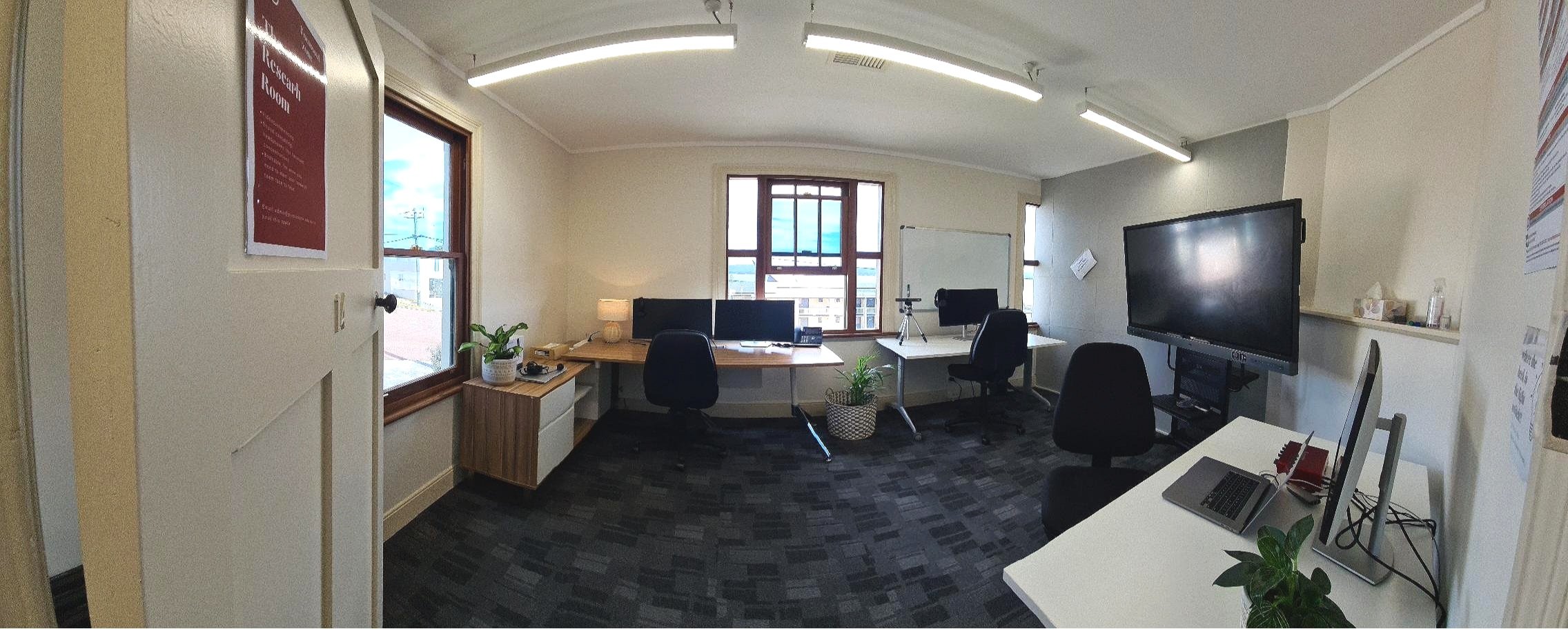 The Research Room is the ideal space for Masters and PhD students needing a professional and inviting space to work. Sound cancelling headphones, multiple monitors, a BENQ screen, and being able to pre-book the room means students can meet with their research teams remotely and enjoy a more focused space to study.
